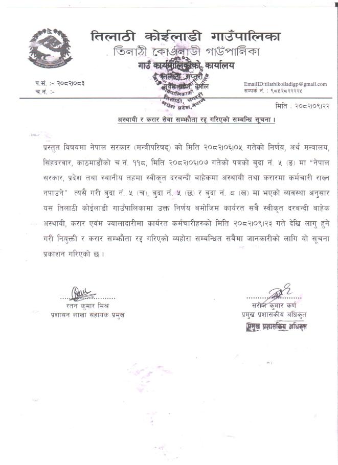 अस्थायी र करार सेवा सम्झौता रद्द गरिएको सम्बन्धि सूचना ।